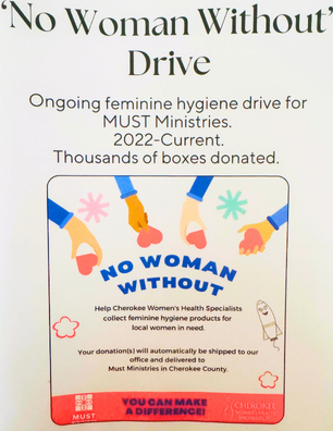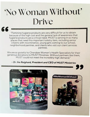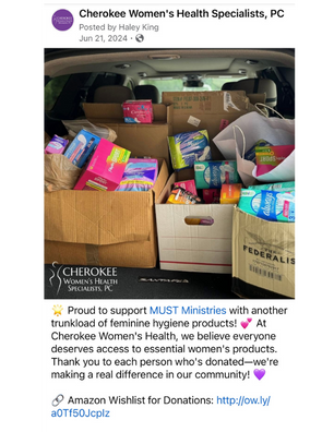 Cherokee Women’s Health Specialists partners with MUST Ministries as a monthly sponsor. In addition to sponsorship, the Cherokee Women’s Feminine Hygiene campaign is an ongoing continuous effort to help women in the community.